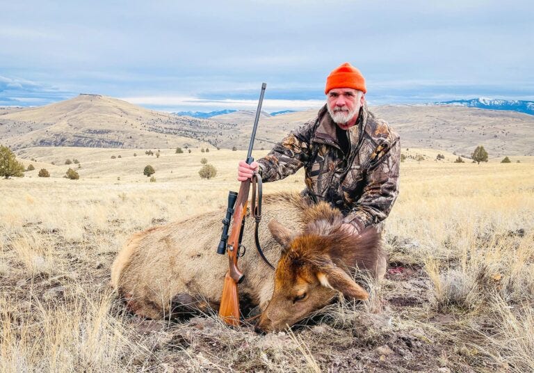 Oregon elk taken at 405 yards in a stiff crosswind with the walnut stocked 30-06 topped by a simple 6x scope zeroed at 200 yards. I hunt a lot with that Remington and am very familiar with it. Several years ago I took a good sized grizzly with that rifle in the Brooks Range of Alaska, wood stock and 200 grain Nosler Partitions for that hunt.