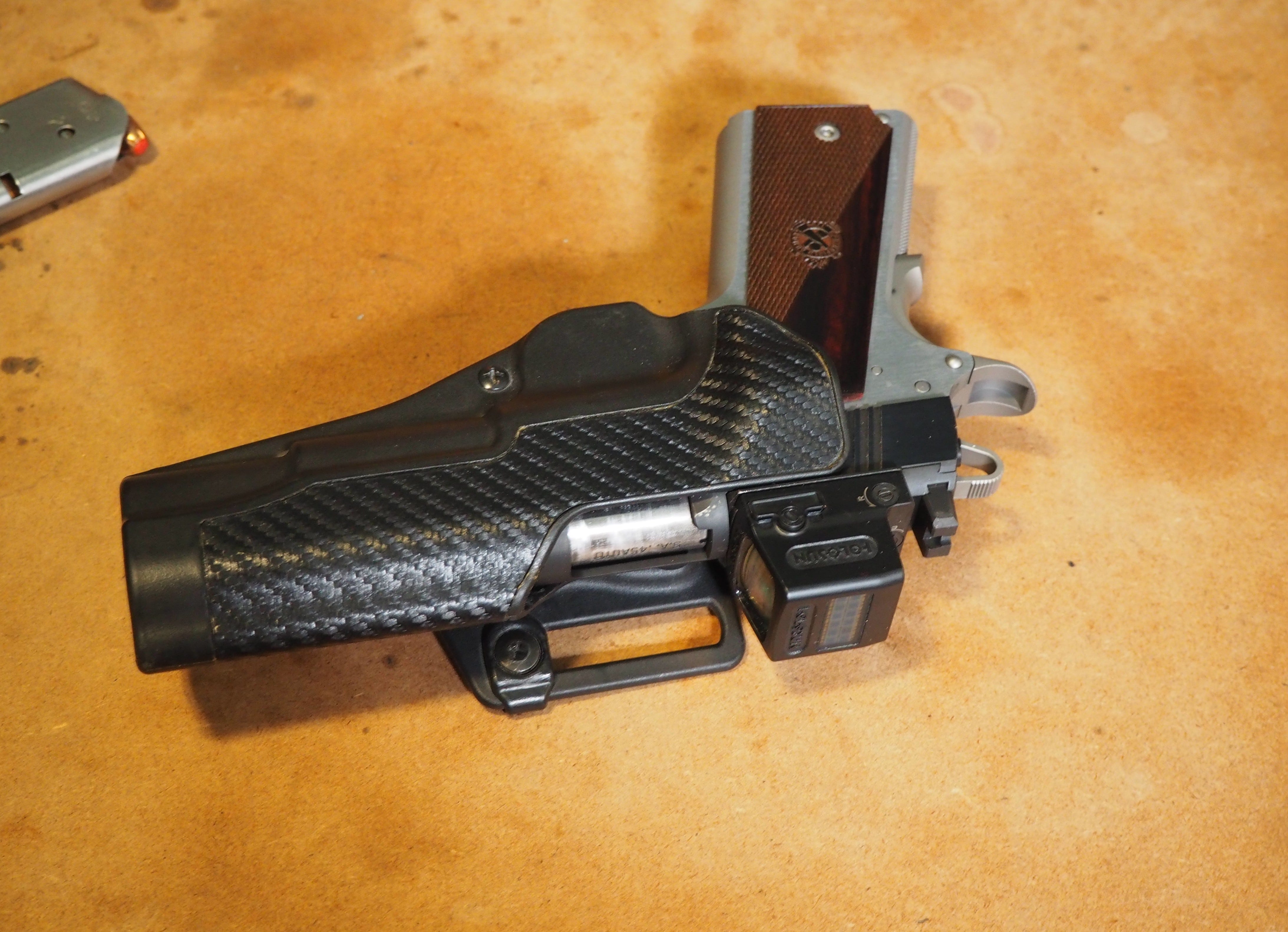 One consideration is that the holster needs to accommodate the sight. Though I have several 1911 holsters, the only one cut for a sight is my Blackhawk Serpa - no not the one with the infamous button, just a simple and sturdy weatherproof holster that clutches the 1911 firmly. I hadn’t used this holster in several years and it was nice to find something comfortable and reliable already on hand in my holster collection.
