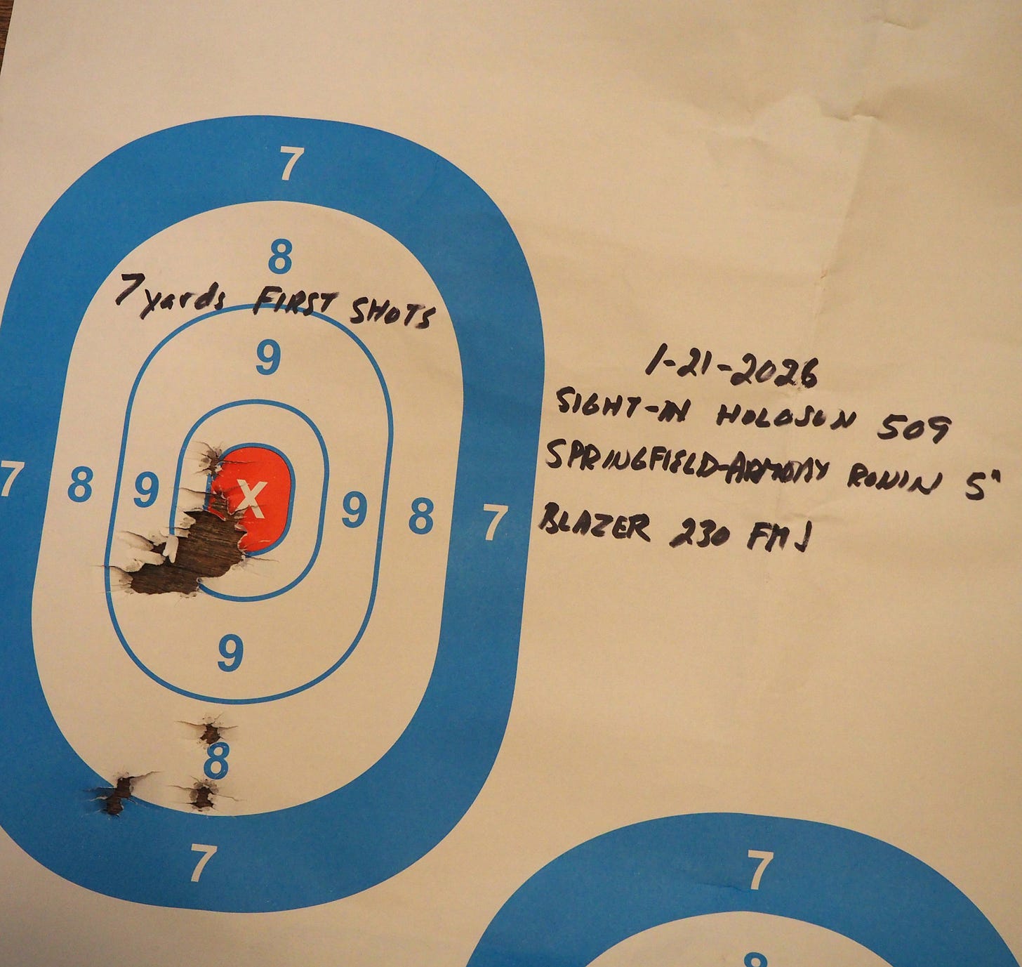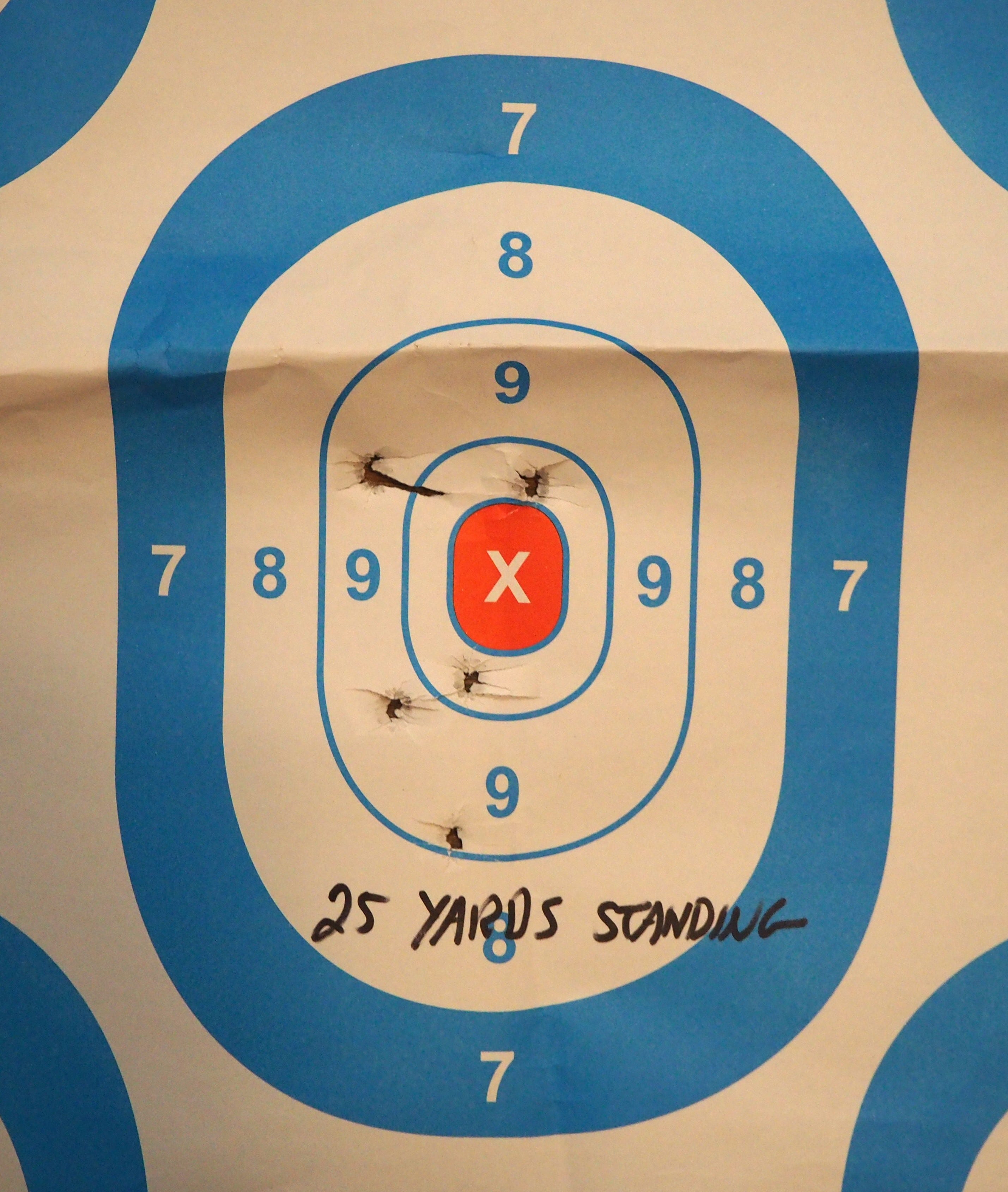 After I got that dialed in at 7 yards, I tried five shots at 25 yards.
